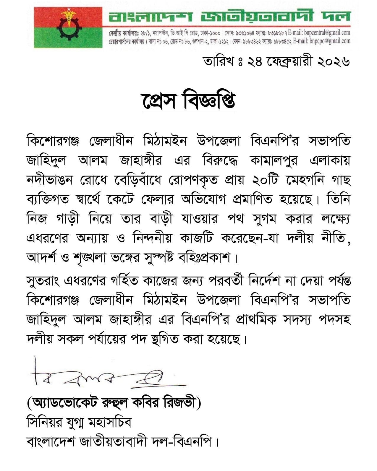 সুতরাং এধরণের গর্হিত কাজের জন্য পরবর্তী নির্দেশ না দেয়া পর্যন্ত কিশোরগঞ্জ জেলাধীন মিঠামইন উপজেলা বিএনপি’র সভাপতি জাহিদুল আলম জাহাঙ্গীর এর বিএনপি’র প্রাথমিক সদস্য পদসহ দলীয় সকল পর্যায়ের পদ স্থগিত করা হয়েছে।